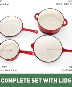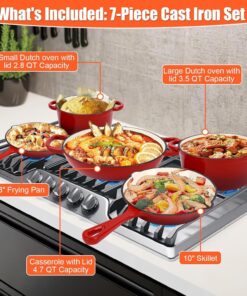 MAISON ARTS Enamel Cast Iron 7 Piece Cookware Set. Heavy Duty Dutch Ovens Pot with Lid. Red Non Stick Pots and Pans Sets. Oven Safe up to 500°F