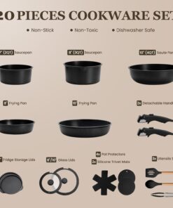 KIKCOIN 20 Pcs Pots and Pans Set Non Stick. Detachable Handle Cookware Sets Nonstick. Non Toxic Induction RV Kitchen Cooking Set with Removable Handles. Dishwasher/Oven Safe. Easy Clean (Black)