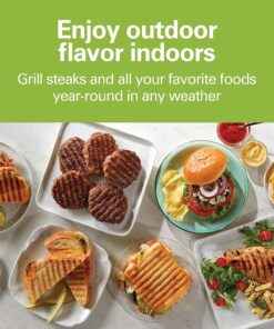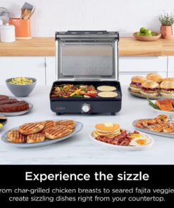 GR101 Sizzle Smokeless Indoor Grill & Griddle. 14” Interchangeable Nonstick Grill and Griddle Plates. Dishwasher-Safe Removable Mesh Lid. 500F Max Heat. Even Edge-To-Edge Cooking. Grey/Silver