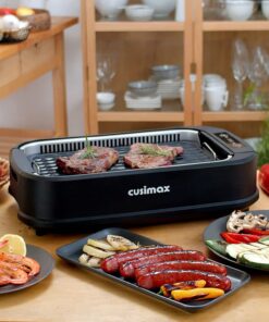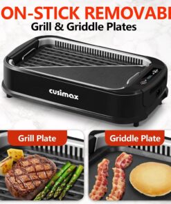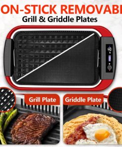 Indoor Grill. CUSIMAX Smokeless Grill Indoor. Electric Grill Griddle. 1500W Korean BBQ Grill with LED Smart Display & Tempered Glass Lid. Non-Stick Removable Grill Plate & Griddle Plate. Red