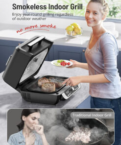 Smokeless Indoor Grill with Air Fryer. Electric Air Fryer Grill Combo. 12-In-1 for Grill. Griddle. Slow Cook. Broil. Bake. Crisp. Roast. Dehydrate. Dual Heating Elements. Easy Knob Control