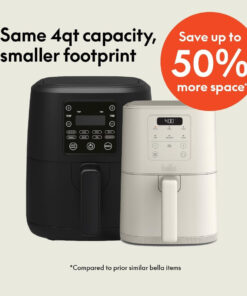 Bella 4Qt Slim Air Fryer. Fits-Anywhereâ„¢ Kitchenware. Evergoodâ„¢ Ceramic Nonstick Coating. Adjustable Temperature. 6 Preset Cooking Options. 60 Min Auto Shutoff W Audible Tone. 3.3Lb Capacity. Oatmilk