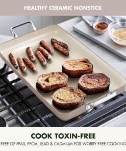 Greenpan 18 X 11 Double Burner Griddle Pan. Hard Anodized Healthy Ceramic Nonstick Pfas-Free. Stainless Steel Handles. Stovetop Cooking. Dishwasher Safe. Oven & Broiler Safe Cookware. Taupe