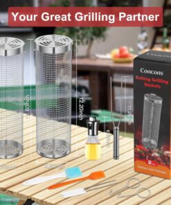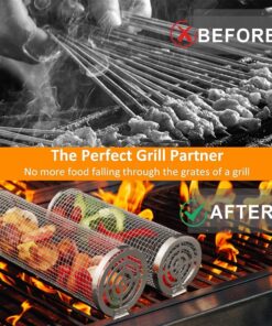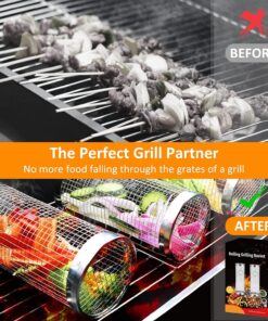 Feniola Rolling Grilling Basket – 2 PCS round Stainless Steel Grill Net for Outdoor Grill for Vegetables. Meat – BBQ Accessories Included
