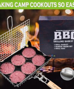 Grill Basket Stainless Steel BBQ Grilling Basket with Burger Press Set.Grill Basket for Fish.Vegetables BBQ Camping Accessories Outdoor Grilling Gifts for Men Dad Folding Grill Basket with Removable Handle