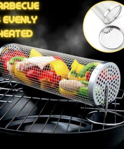 Rolling BBQ Grilling Basket for Outdoor | Versatile Stainless Steel Barbecue Grill | round Mesh Cylinder Accessories | Camping Rack for Cooking – 1 PCS
