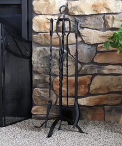 Sunnydaze 4-Piece Fireplace Tool Set with Stand – Heavy-Duty Black Steel Poker. Shovel. Log Grabber and Broom