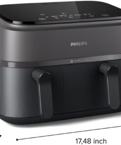 Philips Dual Basket Air Fryer 3000 Series. 8-In-1 Functions. 9.5 Quarts. 2 Drawers. Auto-Sync Cooking Time. 90% Less Fat. Rapid Air Technology. Homeid Recipe App. Dishwasher Safe. Black. (NA350/00)