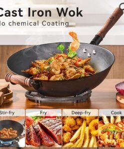 WANGYUANJI Cast Iron Wok Pan 14.2 Large Wok Stir Fry Pan Flat Bottom Wok with Lid and Wood Handle. Suitable for All Cooktops. Uncoated Craft Pot Healthy Cooking Pot