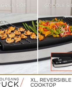 XL Reversible Grill Griddle. Oversized Removable Cooking Plate. Nonstick Coating. Dishwasher Safe. Heats up to 400ºf. Stay Cool Handles