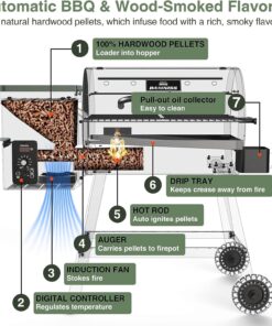 Wood Pellet Grill & Smoker 8-In-1 Multifunctional Portable BBQ Grill with Automatic Temperature Control. Rugged Wheels & Rain Cover. for Backyard Camping Outdoor Cooking Smoke. Bake and Roast