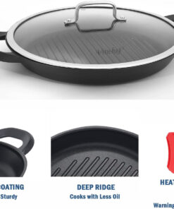 Nonstick Grill Pan for Stove Tops | 13.0 Skillet. Indoor Induction Cast-Aluminum Grill Pan with Lid and Anti-Scalding Tools. GRANITEC Nonstick Coating. Dishwasher & Oven Safe