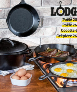 Lodge Seasoned Cast Iron 5 Piece Bundle. 10.5 Griddle. 8 Skillet. 10.25 Skillet. 10.25 Dutch Oven. and 10.25 Lid.Black