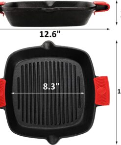 Cast Iron Grill Pan. 10 Square Skillet with Easy Grease Drain Spout and Two Heat Insulated Silicone Handle Cover. Pre Seasoned Grill Pan for Grilling Bacon. Steak. Meats. Camping