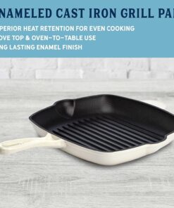 Enameled Cast Iron Square Griddle Grill Pan with Ridges. Helper Handle and Pouring Spouts for Easy Draining. Indoor Grilling Skillet. 11-Inch. Cream
