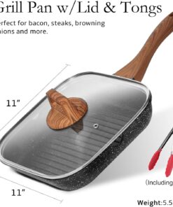 ESLITE LIFE 11 Inch Nonstick Grill Pan with Lid for Indoor Cooking. Versatile Induction Square Large Grilling Skillet Steak Pan for Stove Tops. PTFE & PFOA Free. Black