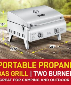 Portable Grill – Table Top Stainless Steel Propane Gas BBQ for Camping and Outdoor – 2 Burners –20.000 BTU Power – Folding Legs – Wind Proof Lid – Easy Clean – Silver – by