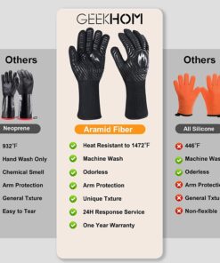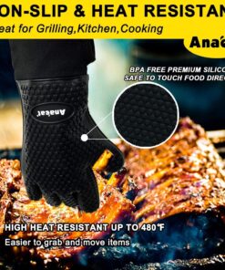 Anaeat BBQ Grilling Gloves Heat Resistant. Versatile Waterproof Cooking Gloves – 100% Cotton Lining Silicone Oven Mitts. Flexible Potholder for Barbecue. Baking – Thick Long Wrist Protection (Black)