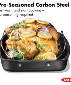 OXO Obsidian Pre-Seasoned Carbon Steel. 15 X 10.5 Roasting Pan with Stainless Steel Roaster Rack. Induction. Black