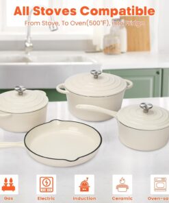 QuliMetal Nonstick Enameled Cast Iron Cookware Set. Pots and Pans with Lid. Frying Pan Skillet. Sauce Pan. Healthy Round Dutch Oven Pot for Sourdough Bread Baking on All Stovetop. Cream White