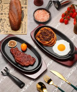 - Complete Accessories: each cast iron fajita sizzling pan has a wooden tray and handle. which can be more convenient and easy to move and provide hand protection. the wooden tray can block the high temperature of the frying pan and prevent the high temperature from damaging the table