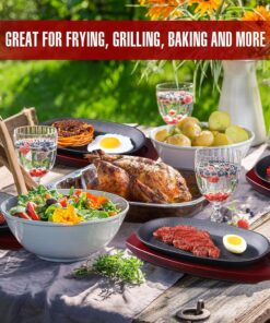- Widely Applied: this cast iron sizzling fajita skillet set can be widely applied in daily household use. holiday. Christmas party. and it can also be applied in restaurants such as rotisserie. grill. cooking. etc.. to provide delicious meals for your guests. or as a practical gift to share with family and friends