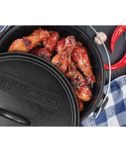 The Pit Boss® Dutch Oven is designed for the outdoors with features like. 3 built-in legs to support the oven over burning coals. a stainless-steel bail handle for hanging over a campfire tripod. and a built-in notch for inserting a thermometer without ever having to remove the lid. In addition. the tight-fitting lid can be used as a side griddle. it works to seal in heat and moisture. features a flat surface for stacking extra ovens. and has a rim around the edge to prevent stacked coals from falling in your food when lifting.