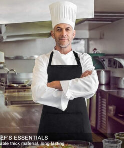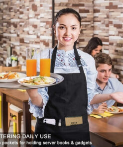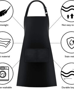 - Nice look. Bright polyester apron. not easily wrinkle. fit perfectly sizes. It looks good on the body. Adjustable bib. adjustable straps. adjust the size as the body changes. and also with the convenient pockets in the front of the apron.