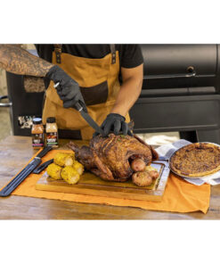 Slice your barbecue creations like a true pit master with the Pit Boss Brisket Carving Set. Use these black stainless steel knives to prep your meat for the grill or slice and serve after cooking. The narrow and lightweight trimming knife has the flexibility to easily remove unwanted trimmings. and the brisket knife features a straight. uniform edge to cleanly slice up meat. Additional features include the ergonomic handle for a comfortable and strong grip. and custom protective sheaths to keep your knives protected during storage.