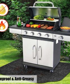 Fasmov under the grill mat size: 36 inches by 50 inches. the waterproof layer traps any spills from BBQ messes and prevents any liquid or grease from soaking through to damage or stain the surface below. Alse. it is easy to storage at the end of the season. Just roll your mat up and store it in your garage. shed or basement.