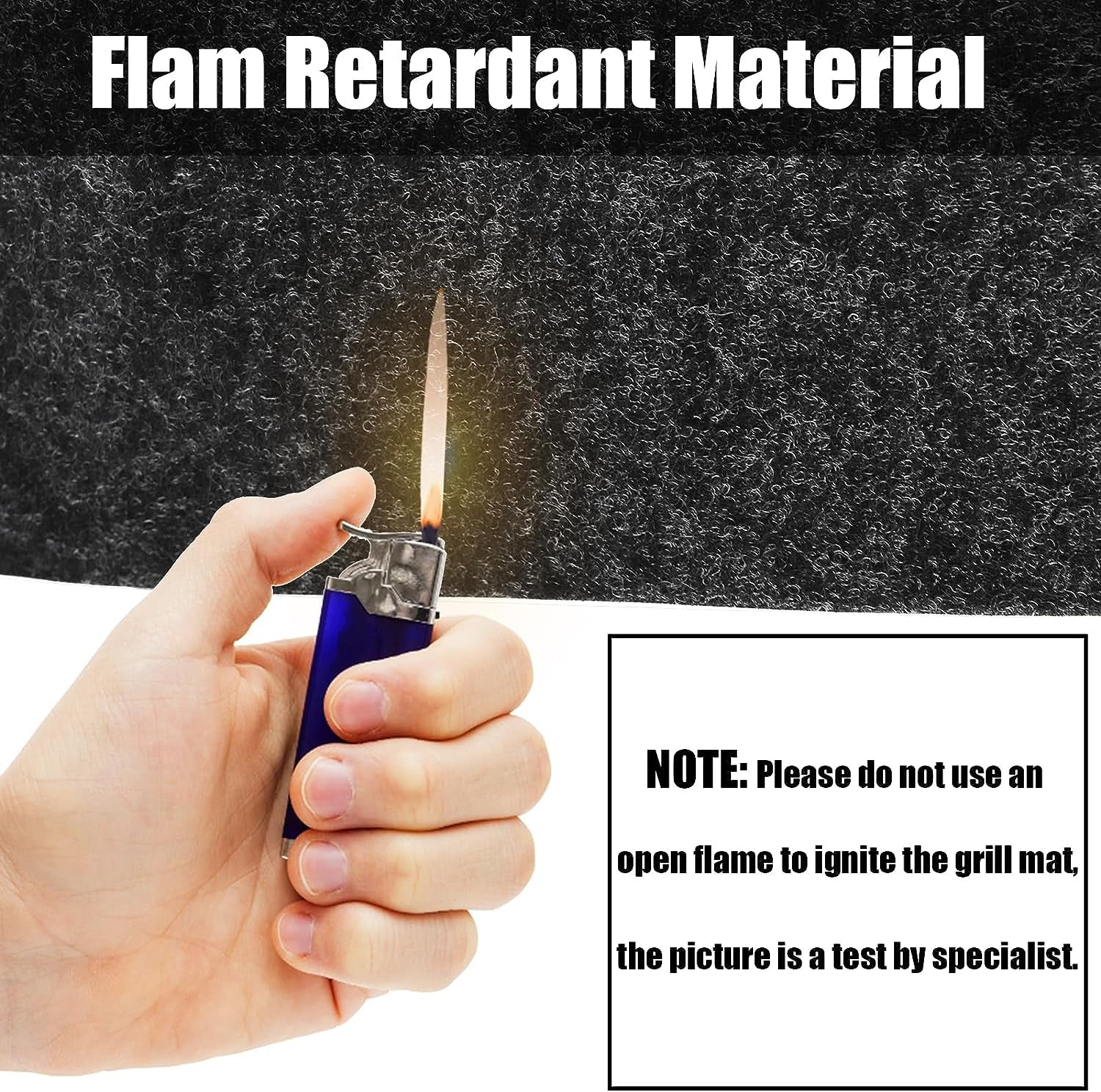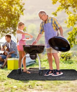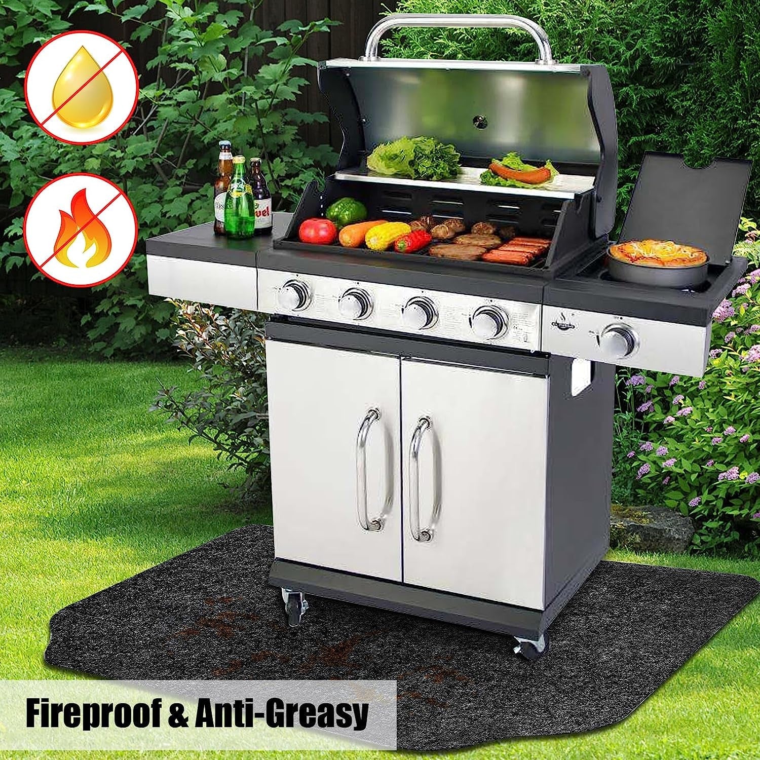 - Grill Mat measuring 36 inches by 50 inches. this protective mat stays safely in place under your grill to collect any spills. splatters and other messes. very easy to cut according to your size. This provides additional protection for your outdoor using area and helps to prevent slips and falls.