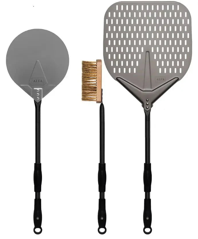 Bring pizzeria precision to your backyard with the Alfa 3-Piece Pizza Peel Set. designed to deliver the ultimate wood-fired cooking experience. This professional-grade set includes three essential tools with 36-inch extendable black anodized aluminum handles—perfect for maintaining control and safety when working with high-heat ovens.