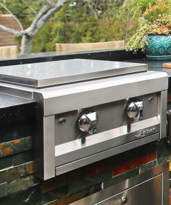 The Alfresco Propane Gas Sear Zone Side Burner is a powerful addition to your outdoor kitchen. featuring a ceramic infrared burner that delivers high directional heat for creating beautiful grill marks and enhancing the flavor of your food with smoke. With rapid preheat capability. you can easily achieve perfect searing or complete cooking of your favorite dishes. This side burner includes a matching stainless steel cover for protection when not in use and is equipped with an ignition system and control knob accent lights for added convenience and style. The durable stainless steel construction ensures long-lasting performance. and the Alfresco logo stamped on it signifies its high quality.