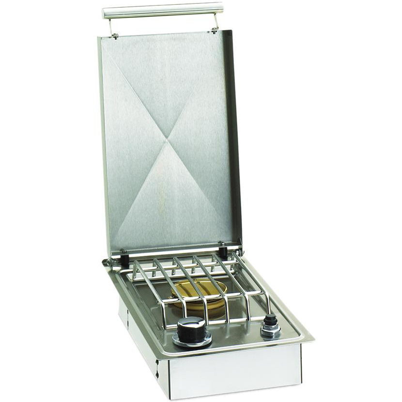 This American Outdoor Grill drop-in side single side burner easily installs into any custom grill island and is perfect for cooking or reheating side dishes and sauces. This gas side burner features 304 series stainless construction. stainless steel rod grid. stainless steel cover. 15.000 brass burner. and electronic push button ignition. No insulated jacket required for combustible installation.