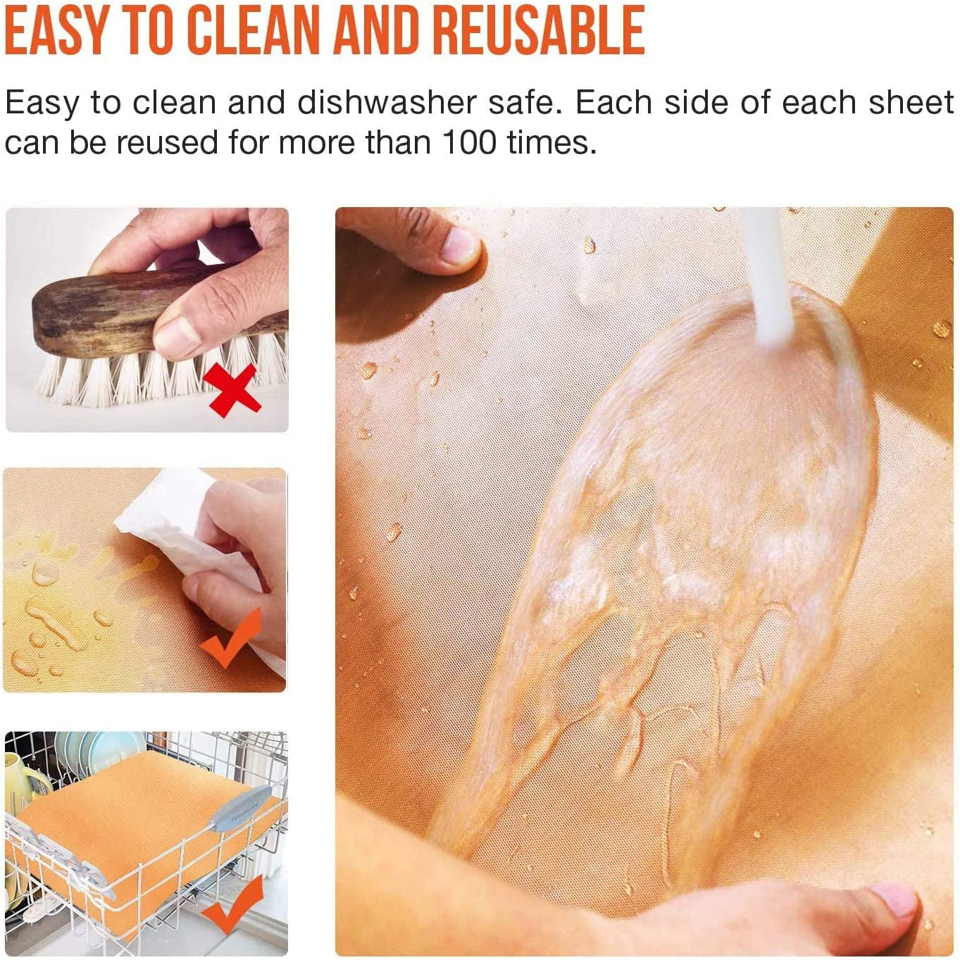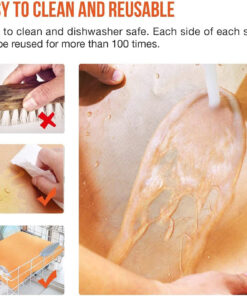 - Resusable and Diswasher Safe -Versatile and highly economical. they can be cut to perfectly fit your pans. Both sides can be used over 100 times. for grilling. roasting. and even baking.Make grilling anything easy and ends messy grill clean-up entirely. These mats are safe for use on the top shelf of your dishwasher. clean-up is a piece of cake.