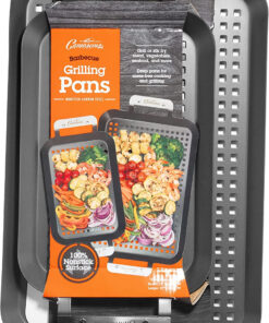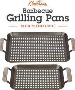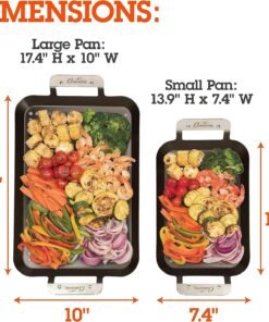 - Camerons Grill Toppers 2 Pack – 100% Nonstick Grilling Surface made of heavy duty carbon steel. (Dimensions: larger pan (17.4 x10). smaller pan (13.9 x 7.4)