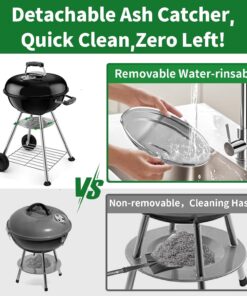 - EASY TO USE&CLEAN: The inside lid hanger hook under the lid could be hung on one bowl handle without hassle to lift it or put it on the ground. The ash leak under the bowl and the ash catcher become the best choice to be one-touch cleaning system. You just need to rotate the ash leak to move the ash down into the ash catcher for easy ash disposal and cleaning. The durable wheels make this charcoal BBQ grill to be easy to move and transport for outdoor picnic tailgate camping.