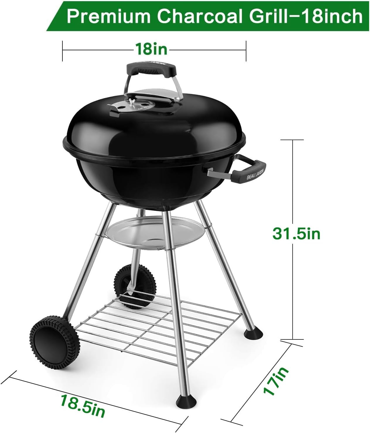 - PORTABLE CHARCOAL GRILL:Portable charcoal grills with dimension of 18 inch diameter by 24-inch high without lid. Durable 18 inch diameter of BBQ grill plated steel cooking grate provides ample cooking surface for any meal of your grilling. A perfect Go-anywhere kettle grill with two bowl handles and durable wheels for outdoor camping by getting your friends or family hovering around the grill. hungry for tempting charcoal flavor of burnt food. Screws and washers are in the bottom of the legs.
