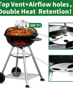 - PERFECT HEAT CONTROL&RETENTION: Rust-resistant adjustable aluminum air vent damper allows for heat control without hassle to lift the lid. Two handles of the cooking grate make you easy to lift it to add or adjusting charcoal. Heavy-duty durable plated steel charcoal grate design withstands the heat of any charcoal fire for a direct or indirect grilling with this charcoal grate. The round porcelain-enameled coating bowl and lid retains heat well to flow for even grilling.