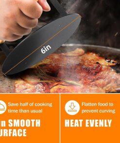 - 6-inch Round Burger Smasher:Rust-proof iron metal press. 6 round design fits in most pans and skillets. good to makes thin burgers and various meats. Be noted that the burger press is not a heavy type. better for grill and griddle press.