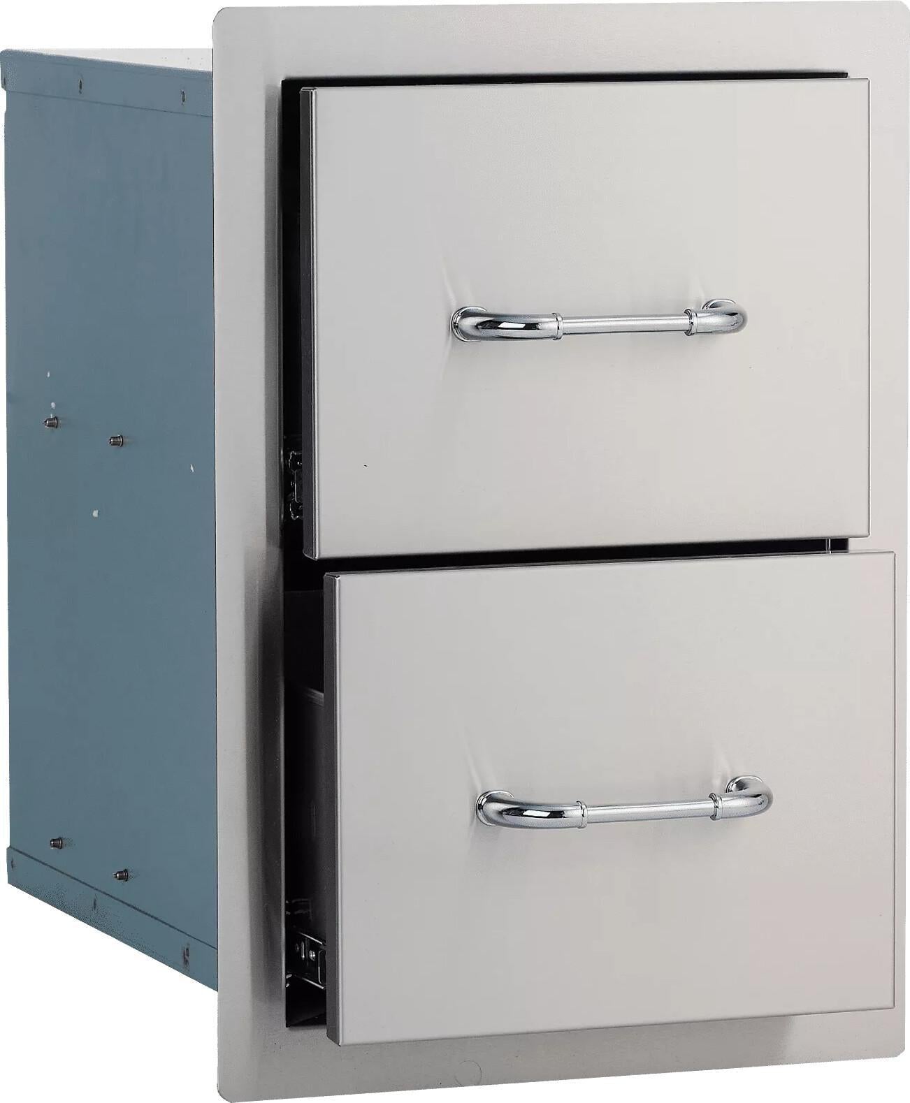 The Double Drawers have 304 Grade 16 Gauge Stainless Steel. fully enclosed drawer components for easy storage of grilling accessories and cleaning products.