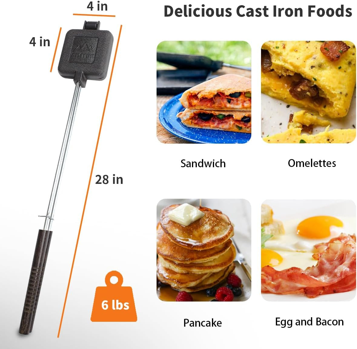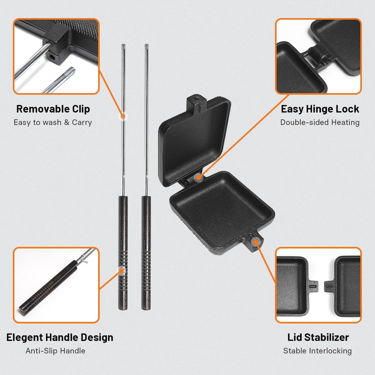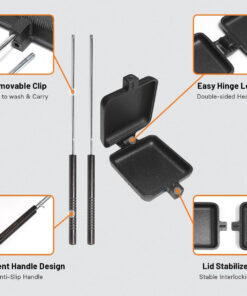 Introducing the new and improved cast-iron head with an easy-open hinge! This durable and versatile cooking tool is perfect for making sandwiches. pies. and grilled meats. Its sturdy construction ensures long-lasting use and even heat distribution. making it ideal for campfire cooking. So whether you’re enjoying a peaceful camping trip or hosting a backyard barbecue. our cast-iron head is a must-have for all your cooking needs.
