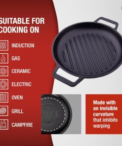 - DURABLE INDOOR GRILL PAN: Our professional cast iron pan was designed with the user in mind. It’s made with highly durable cast iron that has excellent heat retention. invisible curvature that prevents warping. and bigger loop handles for increased stability when you’re using oven mitts.