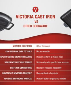 Give your cooking the upgrade it deserves with high-quality cast iron cookware. cast iron cookware is superior to traditional cookware because it offers better heat retention and durability and outlasts more conventional grill pans. The Victoria Grill Pan is commercial-grade and built from high-quality materials with the cook in mind. It features durable cast iron for versatile use. an invisible curvature that prevents warping. and deep dimensions for easy frying. cooking. baking. grilling. and serving. This saucepan can be used on induction. gas. ceramic. or electric cooktops and is safe to use in the oven. on the grill. or over a fire while camping.