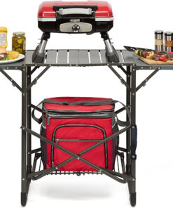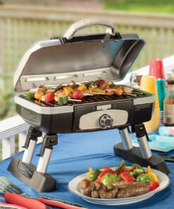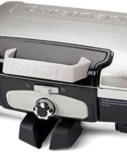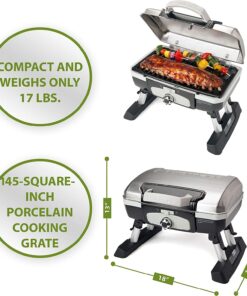 Get great grilled flavor every day from this compact. high-performance grill. Its small format can be put almost anywhere for ultimate convenience. And although the grill is compact. its ample cooking grate is large enough to cook most family meals – 8 steaks. 8 hamburgers. 6 – 10 chicken breasts. or over 4 lbs. of fish! The grill heats up very quickly. and uses far less gas than a full-sized grill. Best of all. with its great portability features this grill can cook your meals wherever you go – the beach. the game. the campsite – anywhere! Folding legs. grill lid latch. generous carry handle. and the spill resistant drip tray all enhance portability. Features: 5 500 BTU|145 square inch grilling surface|Folding table base|Porcelain enamel coated grill grate|Lid latch and spill resistant drip tray
