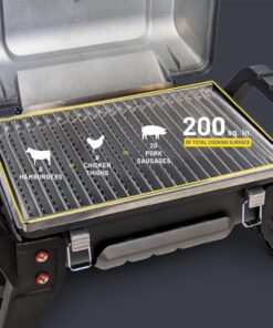 - COOKING AREA: Grill up to 8 burgers. 4 chicken breasts or 12 brats on the 200-square-inch grate.