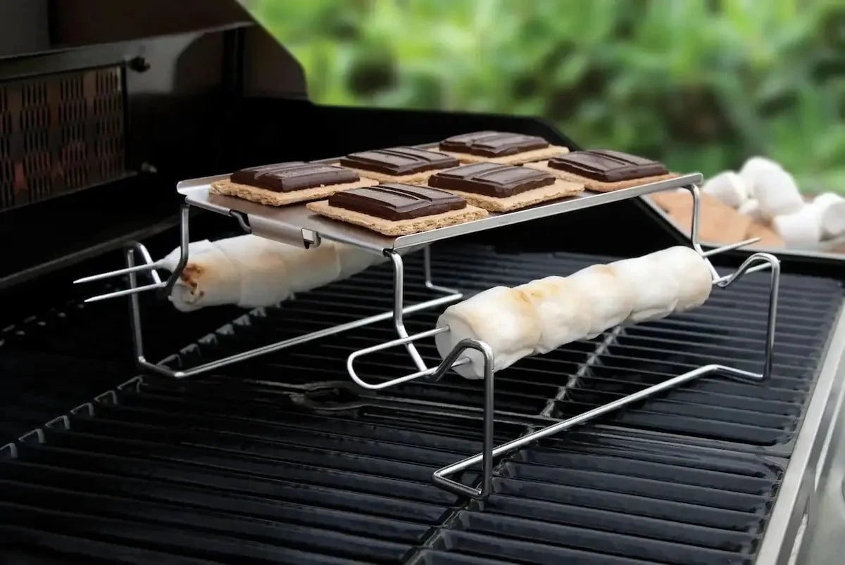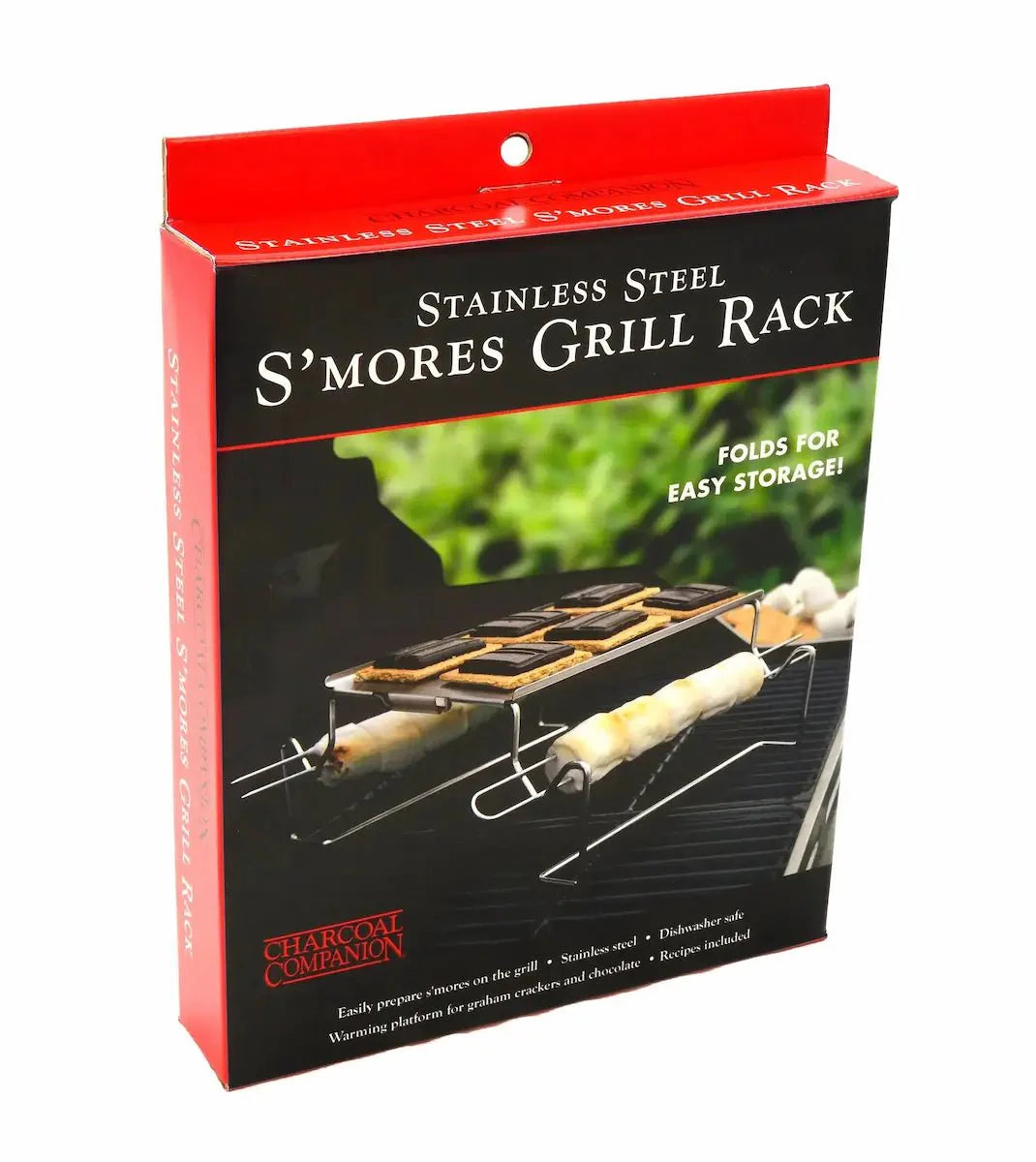 Try making classic s’mores on the grill with the Charcoal Companion S’Mores on the Grill Kit! This convenient kit offers the authentic campfire taste of America’s favorite dessert. cooked with a gas or charcoal grill. It comes with a foldable rack and four double skewers for easy storage and use.