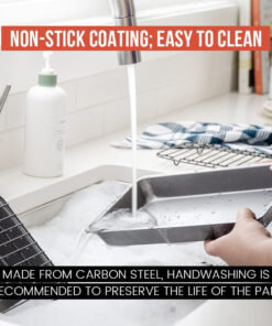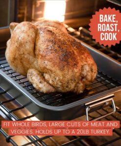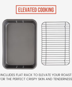 The high-quality carbon steel manufacturing of our heavy-duty roasting tray optimizes its strength and durability while enabling even heat conduction throughout your food. The wire rack drains excess juices and fat into the pan below. while allowing the toughest cuts to cook through. The non-stick coating makes serving your dish a smooth process. keeping it presentable without leaving any charred bits stuck to the pan. Once you’re done cooking. wash the pan and rack by hand to preserve their life. Occasionally. you may also load the pan into your dishwasher.