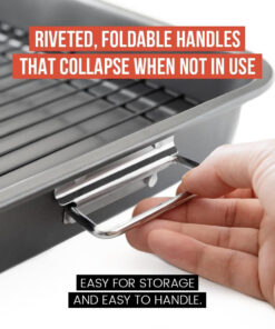 Heavy Duty Carbon SteelThe design of our large roasting pan features sturdy. foldable. securely riveted handles. The strong wire rack can hold up multiple servings of food. The foldable handles further allow convenience of use while keeping it compact. Roast turkeys with all the stuffing even ease! |