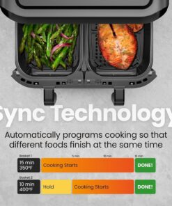 - FOOD FINISHES TOGETHER: Convenient Sync Finish allows individual 3-quart large capacity air fryer double baskets to finish cooking at the same time
